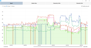 I roamed around while watching the signal strength of my connections, and I noticed that the 2.4ghz bands (there are 2) keep dropping. In the image they are the red and blue lines, and dark green and...
