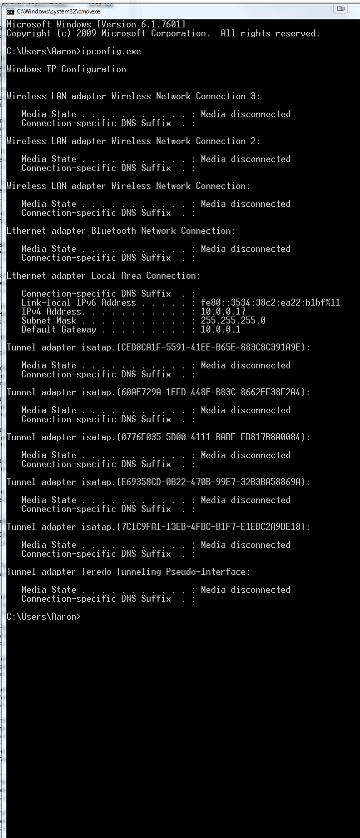 at the end of his video he shows his IPconfig and it's not the same as mine, I don't know if this indicates an issue but it's not the same formatting so just going to post both, his is named Glasscock (his last name)