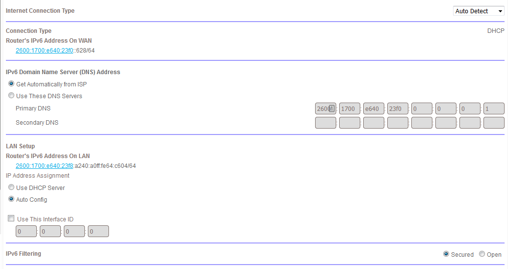 LAN Status Up Link Local Address fe80::de7f:a4ff:fe67:291 Delegated Address/Subnet 2600:1700:e640:23f0::1/64
