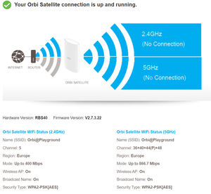 I understand that you are having network connection issues with your 5GHz network band on your RBS40. Your RBS40 is able to successfully receive 2.4GHz network connectivity from the router. Your satellite could be just out of the 5GHz network band of the router.