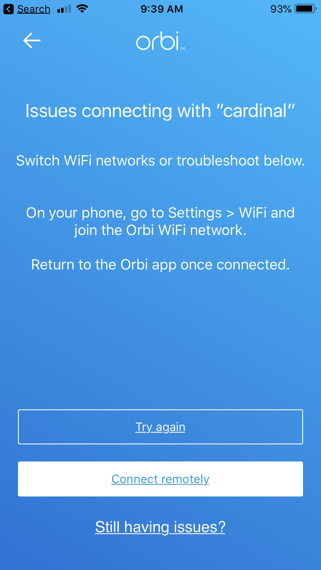 While composing this message I checked my Orbi App. It said it couldn't connect with the Orbi's. See attached. 5 minutes later it asked for the password and logged in. If I knew about this stuff it wouldn't frustrate me as much.