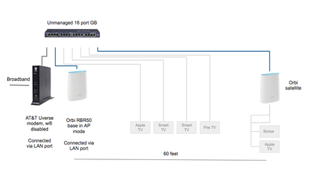 Ok, sounds good. Just making sure your switch isn't managed. Orbi doesn't like Managed switches for some reason. Hope the new configuration works better.