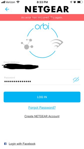 I am trying to access my Netgear account for remote management on the iOs app and I keep getting a message "An error has occurred. Try again." It doesn't matter how many times I try it, it doesn't wo...