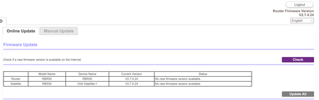 I have an Orbi RBR50v2 with one RBS50 satellite. Accessing the router shows that it has V2.7.4.24 installed on both devices and that there is no new firmware available. The netgear site, however, sho...