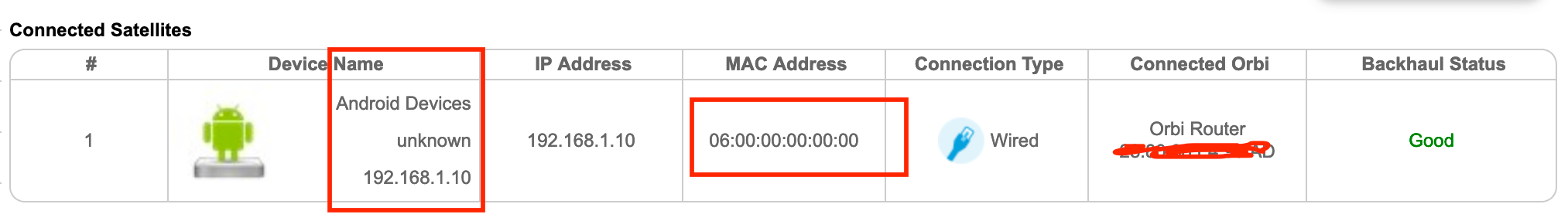 The router cannot resolve the Satellites "Device Name", it thinks the Satellite is an Android device (wth??), "not to mention the awesome MAC address..