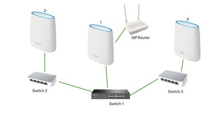 The number of switches is not significant. Some switches are not compatible with Orbi backhaul.