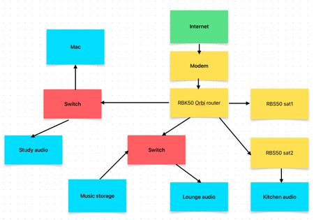 - Audio systems (study, lounge, kitchen) are all 'wired', correct? > correct, study and lounge wired to Orbi router and kitchen wired to satellite