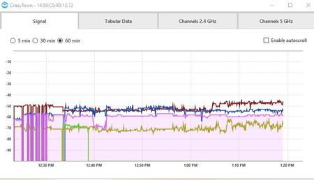 Further to the changes you suggested yesterday I reset the modem. In doing so it reverts to the dual modem/router functionailty. I ran it this way for approx. 30 mins (eliminating Orbi from the chain). I reviewed the NetSpot logs and saw exactly the same issues - solid then bouncing. The bouncing started at the moment I was on a videoconference.