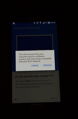 I just bought a Chromecast Ultra at Best Buy in California and tried to set it up on my Orbi AP, bought in California also. This is the error I get . I had to use my DSLR to shoot a picture of th...