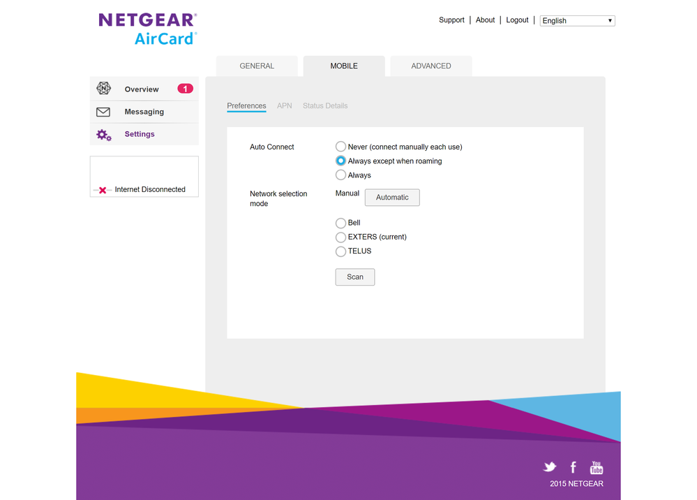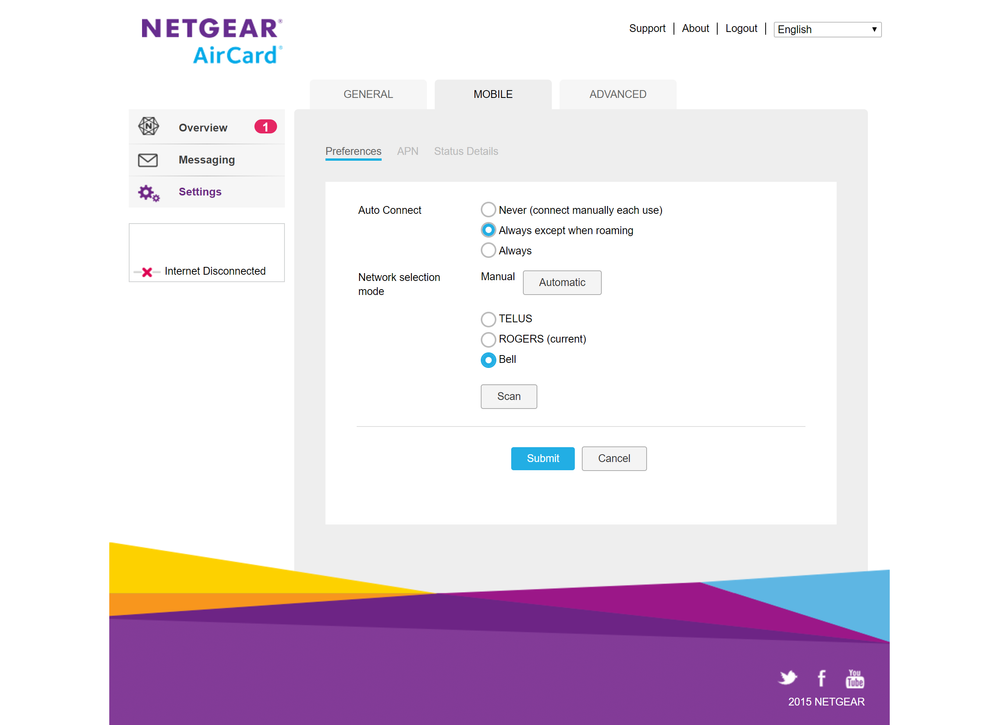 I check the APN settings and notice it's set to pda.bell.ca. Check on the Bell site, and for turbo sticks it's supposed to be set to inet.bell.ca. So I change it. Still no connectivity.