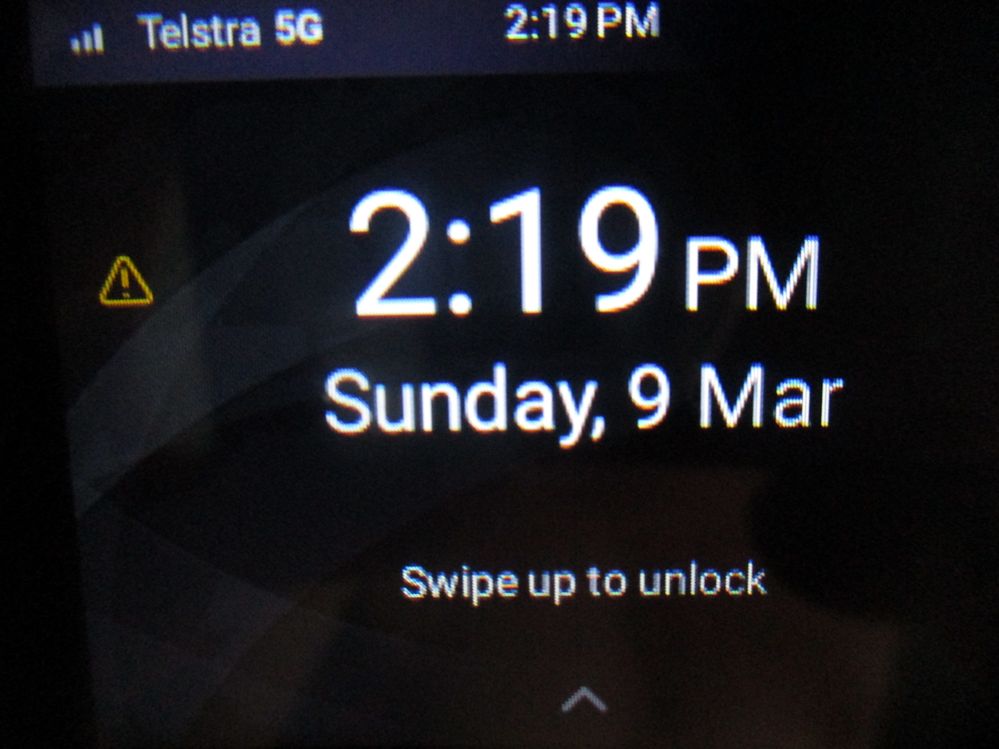 The small red triangle is on the "front" page of the device with the time, signal strength, etc. Swiping up doesn't pop up the error message.