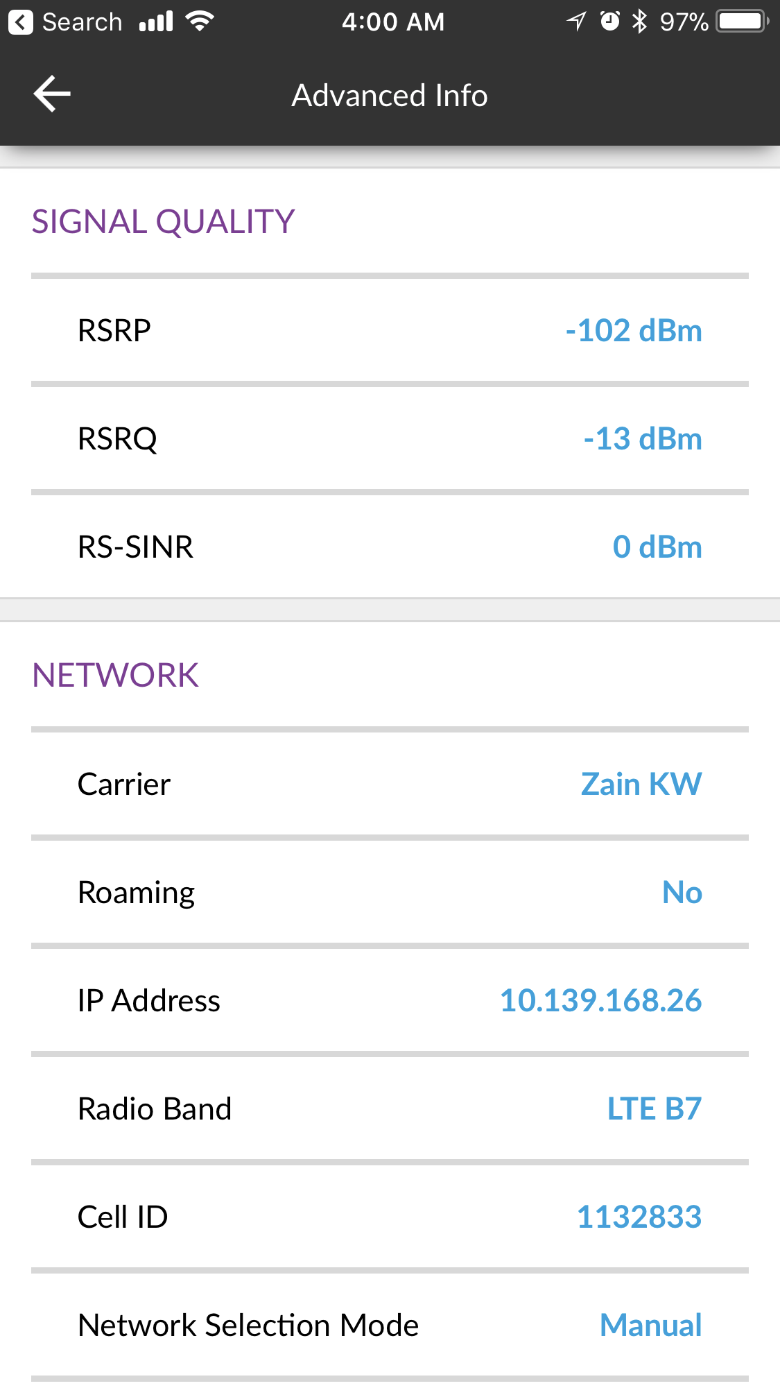Nighthawk M1 Advanced info for Signal Quality