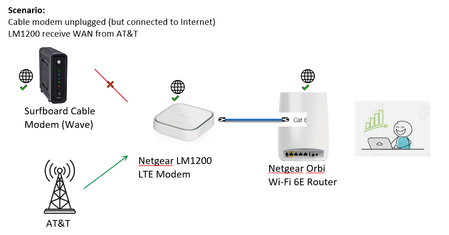 It looks like the issue is with the LM1200 not properly failing over when both WAN sources are available. In scenario one, the failover works correctly when the cable modem is unplugged. However, in scenario two, with the cable modem plugged in, the LM1200 doesn’t switch to cellular as expected, possibly because it still sees the cable modem as "up" even if there’s no actual internet. When testing directly with your laptop (scenario three), it confirms the LM1200 is still passing through the upstream modem without checking true internet availability. One fix could be to ensure the Orbi router is detecting actual internet access before sticking to a WAN source, or manually disable the main WAN if it’s down. Unfortunately, the LM1200’s failover isn’t always smart enough to detect loss of internet, only physical disconnection. You might try setting the LM1200 to monitor a more reliable host or reduce the ping interval, but ultimately this sounds like a limitation in the LM1200's failover logic.