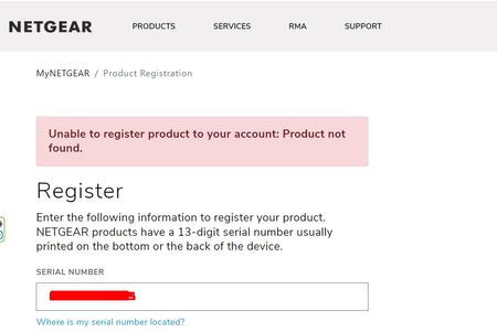 I bought the MR6110 router on Amazon and now when I try to register it using the serial number it says "Unable to register product to your account: Product not found." Anyone else having this proble...