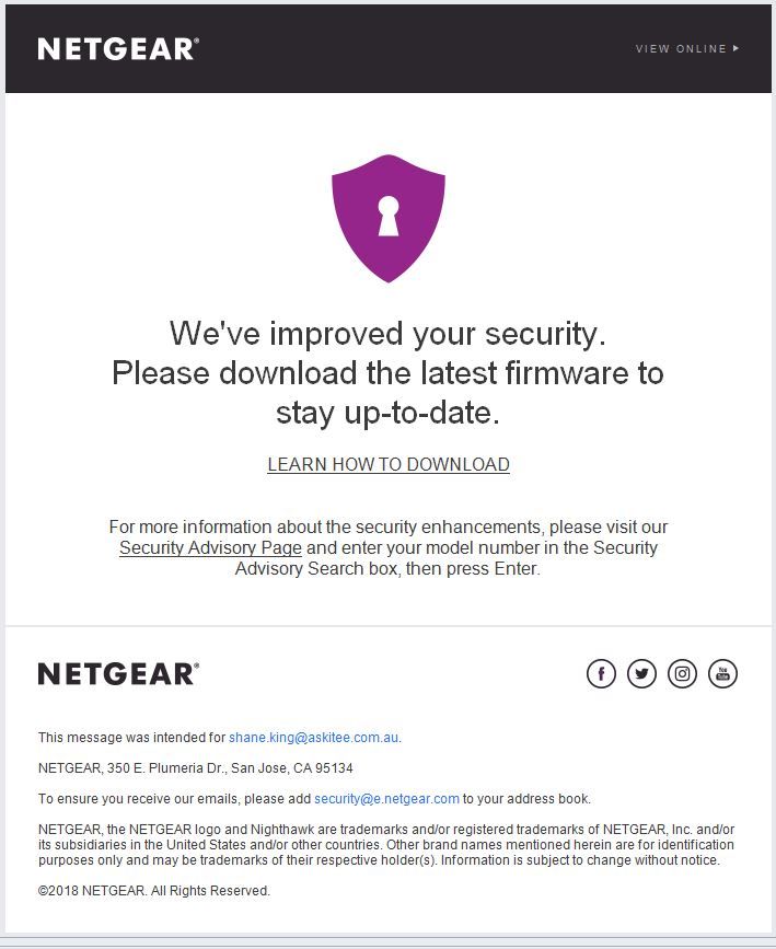 Hi Dane and thanks for the response. So to clarify my question, is this a legitemate email advisory or a scam. If it is legitemate can you tell me what the update is for. If Netgear is as serious about security as you infer, I imagine you'll be quick to respond so that we can act on it.