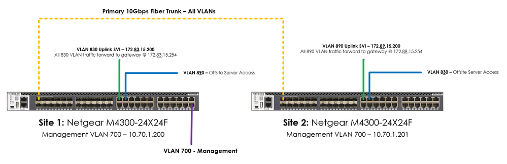 I purchased two M4300-24X24F switches that are going to be placed at each site with a fiber trunk connecting the sites. I have three total VLANs configured (4 if you include VLAN 1) on both switches: