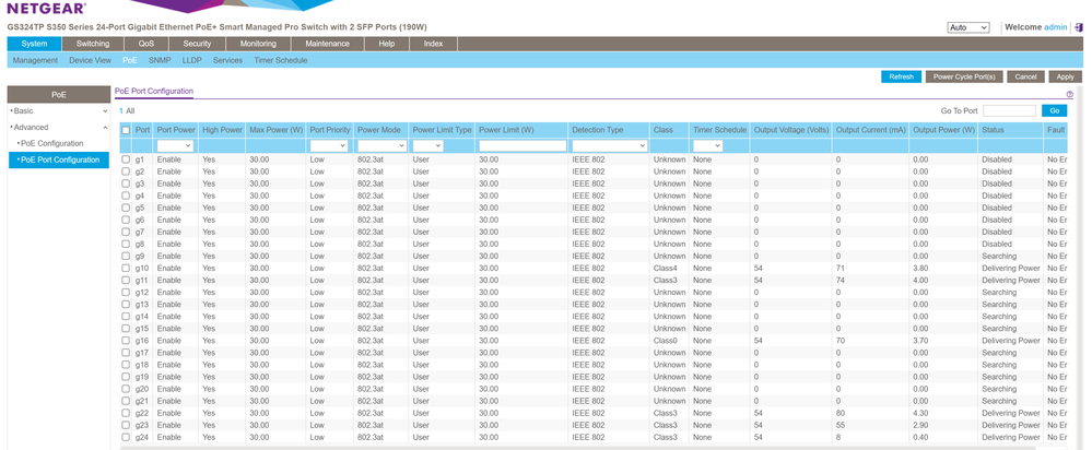 I recently "lost" POE capabilities in ports 1-8 on my GS324TP POE switch. It worked fine before. I have rebooted, and power cycled numerous times. I have updated the firmware from 1.0.0.38 to 1.0.0.43 and the same results. I moved the non working POE camera feeds to ports past 8 and they work fine, so this is clearly the problem of the switch.