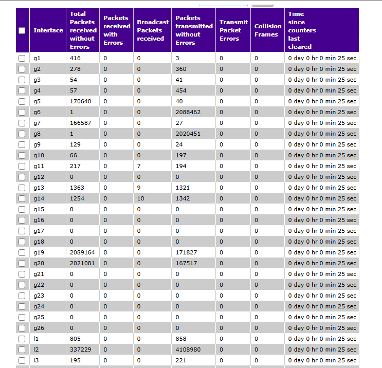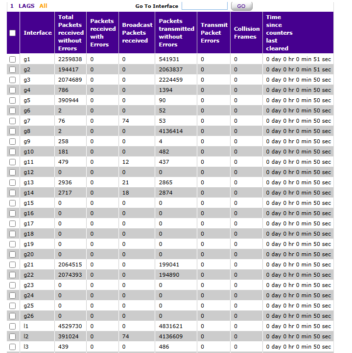 Port 21 and 22 are receiving ~2050000 packets each. These are transmitted to the router on lag1 and it seems like it decided to use port 2 and 3 for the task.
