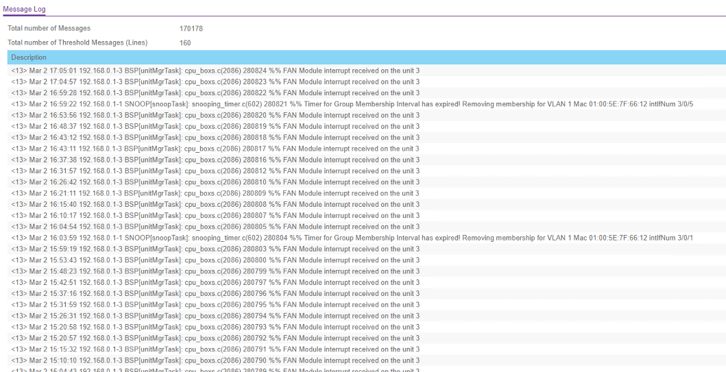 <13> Mar 1 08:58:56 192.168.0.1-3 BSP[unitMgrTask]: cpu_boxs.c(2086) 279403 %% FAN Module interrupt received on the unit 3