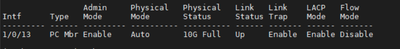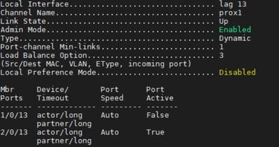 Port 1/0/13 and port 2/0/13 lag configuration Hash mode 3 both ports Active.