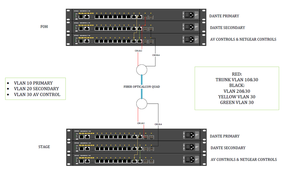 Setup m4250 redundancy with fiber from FOH to stage and back