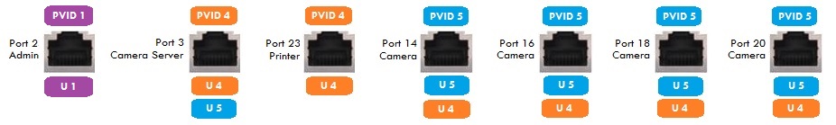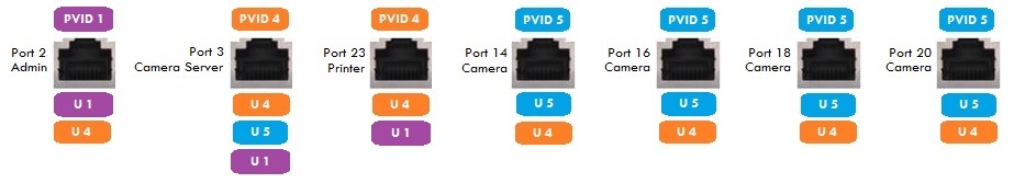 For ports 14, 16, 18 and 20, it should be set as untagged (U) with PVID = 5. These ports should also be set as untagged (U) on VLAN 4 in order for the camera server to have access to the cameras.
