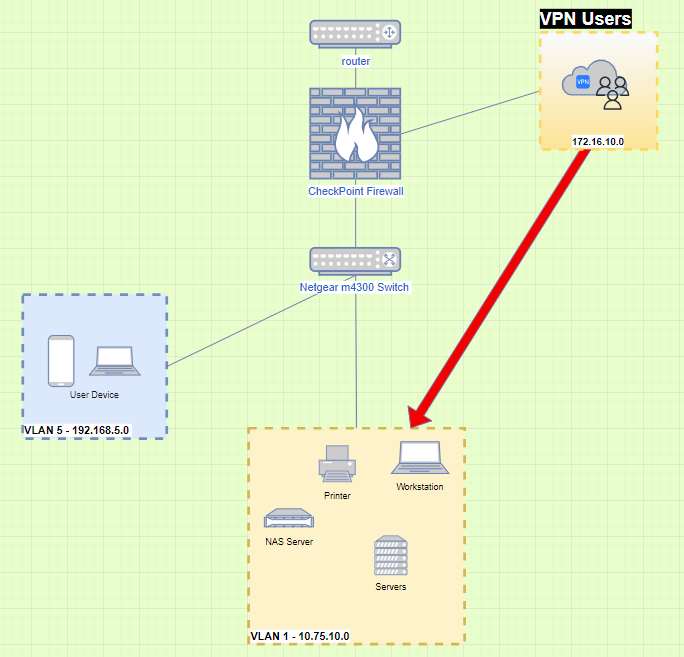 Above the switch is a Checkpoint firewall that can grant VPN remote access on a specific IP subnet, in this instance 172.16.10.0/24. I aim to permit VPN users to access VLAN 1 but not VLAN 5. Now, my question is, do I need to create a VLAN on the switch to accommodate the 172.16.10.0/24 subnet and then create IP ACL rules to permit or deny access?