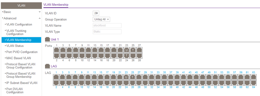 One question I have is how to interpret the vlan membership table. The UI displays Unit 1 and LAG and I'm not sure if I modify both port in each table. Below is a screenshot of switch#2's vlan membership of vlan#1