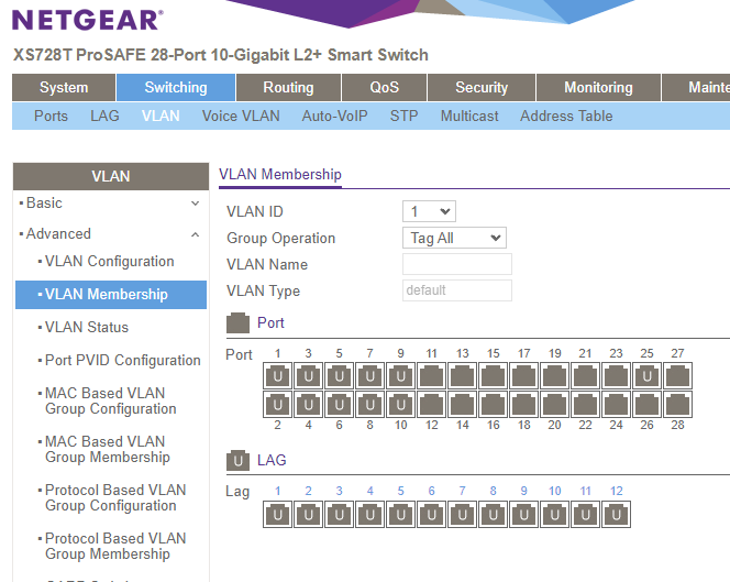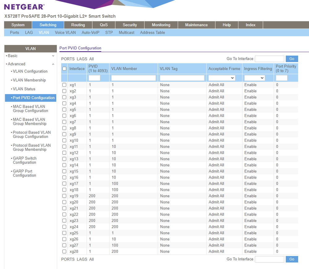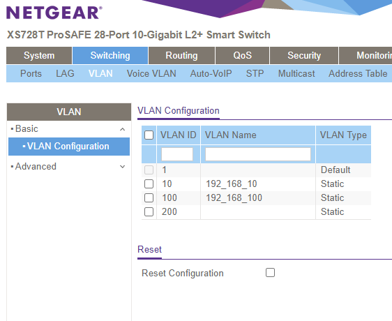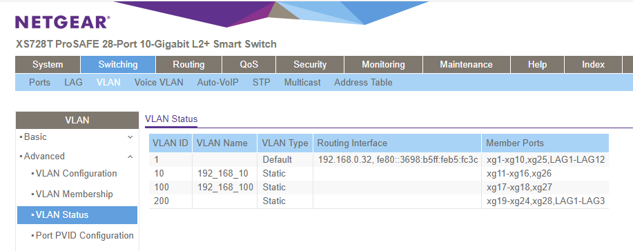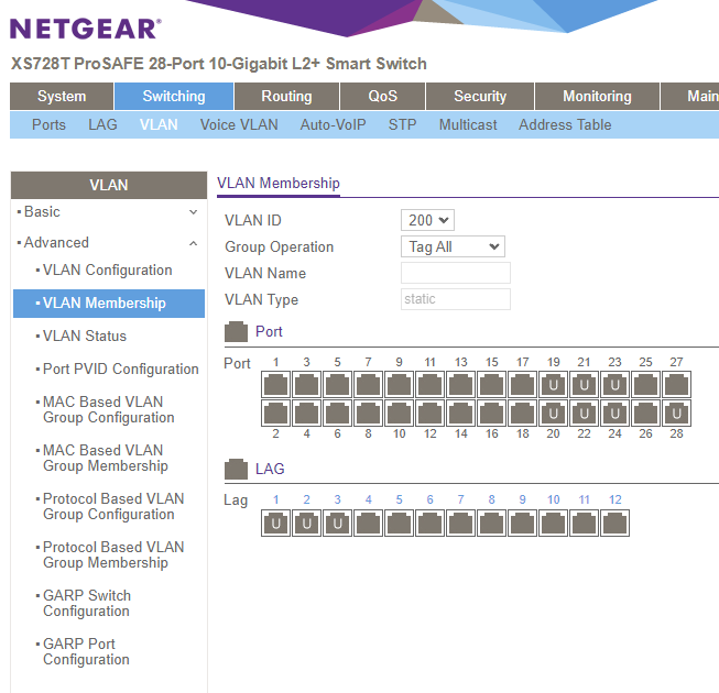 I want to set up 4 independent networks on one XS728T. (In fact I have two of them. I have four separate networks and I would like to overcome longer distances by fiber cables.) I therefore configured 4 VLANs with IDs 1, 10, 100, and 200. I assigned them to ports in the VLAN Membership configuration. It works fine when I only plug in cables to VLAN 200 ports, . As soon as I plug in cables to VLAN 1 the traffic stops also on 200 and I also no more can access the switch. Any idea what I have made wrong? Please see the attached screenshots.