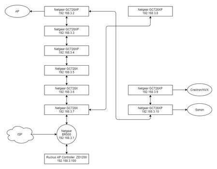 Device List: NETGEAR BR500 x1 NETGEAR CG728X x3 NETGEAR CG728XP x6 Sonos Port x12 First scenario: Those switches go through the optical fiber to make them connected like the below image. https...