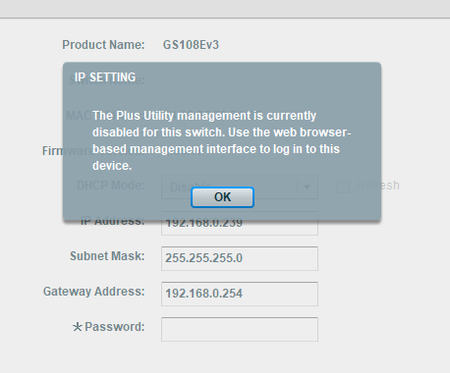 Hello, I just bought a GS108v3 for my house network and the admin page cannot be accessed. I've set my computer IP manually to be on the same subnet (192.168.0.3). I can see the switch with PROSaf...