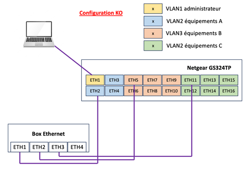 When I realize the configuration below with 3 ports of the Ethernet Box connected I have a conflict between my equipment which is therefore no recognized