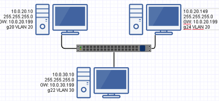 Hi, I've got a couple of VLAN's setup as a test but I am struggling to get routing between them working and I must be missing something simple. The setup is like this: ...