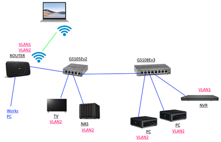 s Hi, I have a GS105Ev2 and GS108Ev3 connected in my home network in the following configuration: and was wondering whether it would be possible to use the VLAN feature to segregate parts of...