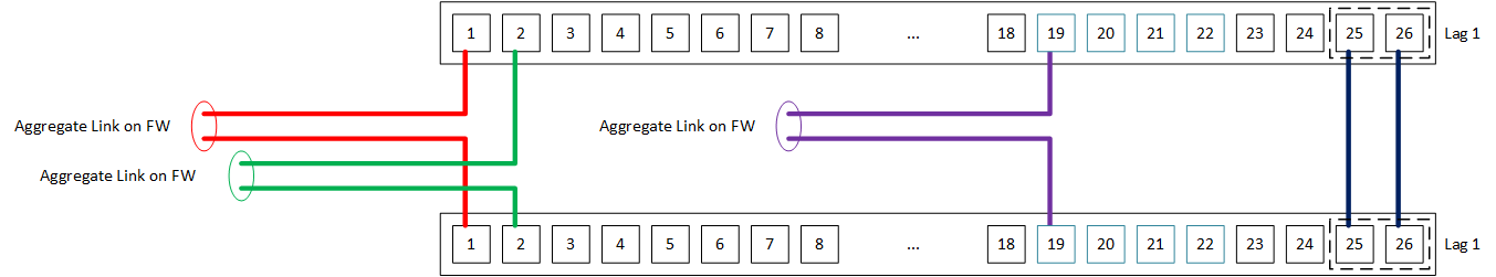 Hi schumaku thank you for your time. Sorry maybe the scheme is not clear. In actual configuration just the ports 25 and 26 are belonging to a LAG so I just configured one LAG. The aggregated links are on firewall side that is not a Netgear one. On the switch side I have a single port dedicated to the aggregated link per each switch. So ports 1, 2 and 19 on switch 1 are receiving a cable from the firewall (one per subnet) and the same on switch 2.