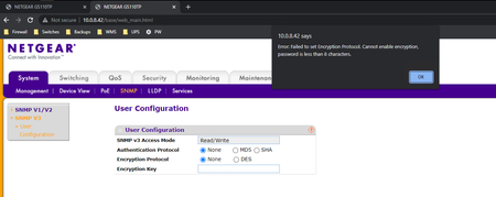 Netgear GS110TP - Error when trying to enabled SNMP v3 - Error: Failed to set Encryption Protocol