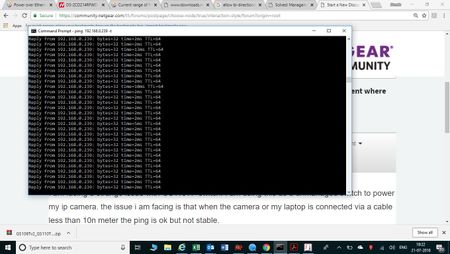 4. Disconnect the GS110TP switch from the existing network. Connect one (1) camera and a laptop directly to the GS110TP switch. Then, set a static IP address on both IP camera and laptop. On your laptop, do a continuous ping to the static IP address of the IP camera. Does same problem occur? Post a screenshot of it.
