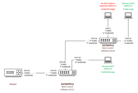 We've got an interesting issue trying to get VLAN traffic to pass between a couple of our switches. At a high level, our topology is as follows; The issue is that we are not getting DHCP address...