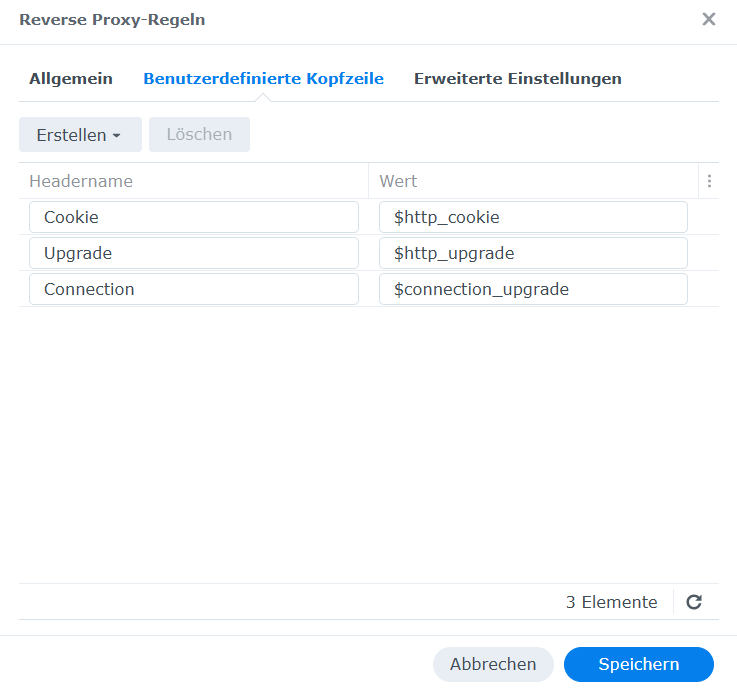 The first error which I solved was that I could not log me in, because the credential mask infinitely loops. This I could manage when setting a proxy header "Cookie $http_cookie" in my reverse proxy settings on my Synology.