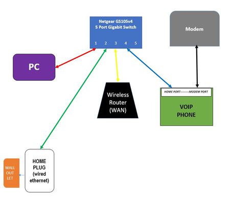 I have a 5 port switch connected to my pc, VOIP (phone), homeplug (wired ethernet), and wireless router. My internet download speeds are running at about half of what they should be (compared to w...