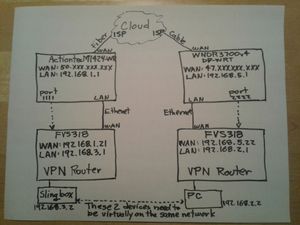 I am trying to create a VPN connection between two FVS318v2 routers both running firmware V2.4 (July. 19 2004). Each FVS318 router is connected under the main gateway router that connects to the Int...