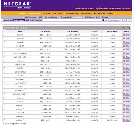 Regarding the two 192.168.0.226 entries, using the GS108E management utility, I checked the MAC of the SancSW and it is dc:ef:09:ce:19:98 and not dc:ef:09:d8:08:87. So, I deleted the old SancSW entry in the database and then established a name SancSW on the correct database entry. The table looks good now, however I do not trust the FVS318N "LAN Groups" database listing. Besides the problem I just fixed, I noticed there are times when the router's wireless connections don't show up in the database, and times when they do. Another,anomoly, When I create a specific name for an entry and get a new listing the table doesn't show the "*" for that entry when it is allocated an IP via the router's DHCP server. I have to manually add the asterick to the name of that device.
