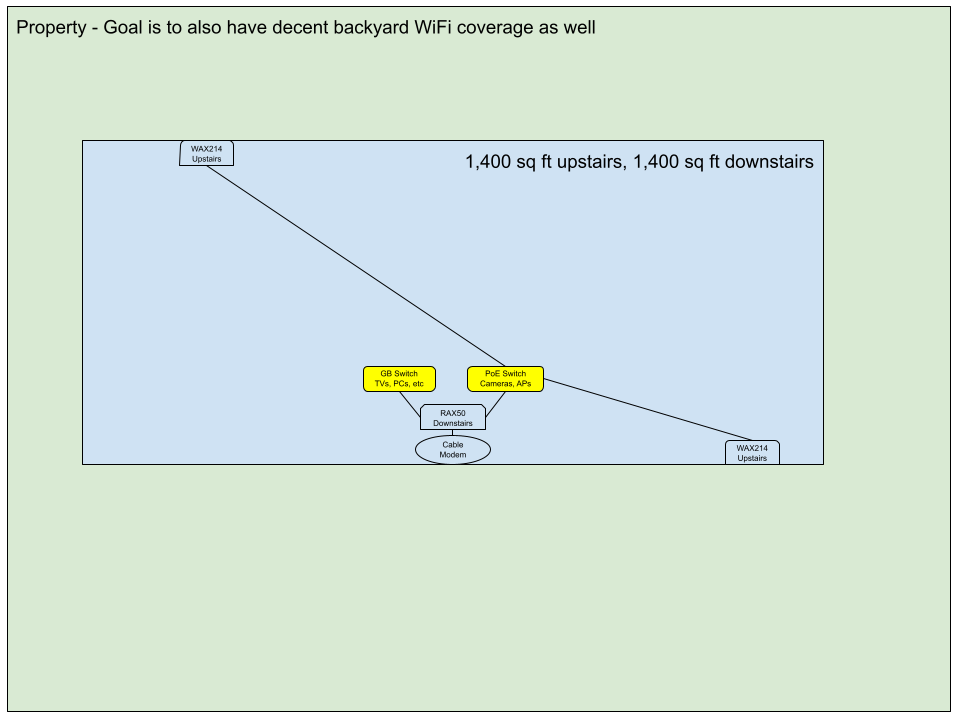 My plan is to put an RAX50 Router next to the cable modem and mount two WAX214 PoE Access Points on the each end of my home. I have an Unmanaged Gigabit Switch and an Unmanage PoE Switch that will both connect directly to the RAX 50 Router.