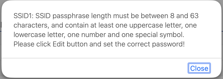 SSID1: SSID passphrase length must be between 8 and 63 characters, and contain at least one uppercase letter, one lowercase letter, one number, and one special symbol.