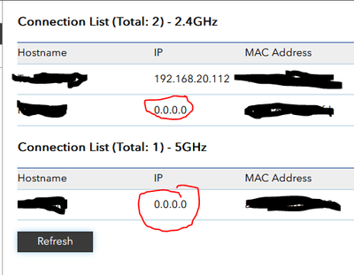 Randomly, I have seen the similar issue where a connected device does show up with an unresolved 0.0.0.0 IP address. Rarely, even two of my test devices are affected, and sometimes show up with an unresolved IP address 0.0.0.0.