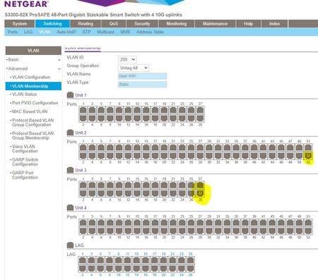 Ich habe die Ports für meine virtuellen Netze verlegt. Die Ports xg49 bis xg52 haben bei mir nicht funktioniert, g1 bis g48 jedoch schon.Mit diesen Ports konnte ich arbeiten und sie zu VLAN Mitgliedschaften, tagged und auch untagged, überreden.