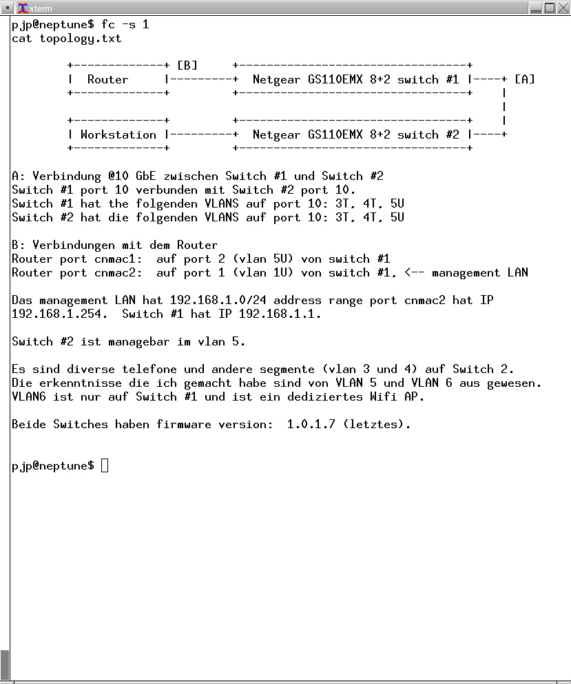 Der switch ist im Flur im Cabinet. Der andere switch ist im Büro, ein dritter switch der OpenBSD basiert ist, ist im Wohnzimmer. Als attachment gebe ich dir informationen, wie die zwei Netgear switches zusammen verbunden sind in einem file topology.txt. die screenshots im gleichen thread sind von switch #1.