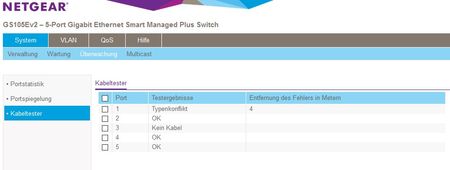 GS105Ev2 – 5-Port Gigabit Ethernet Smart Managed Plus Switch einen „ Typenkonflikt an Port 1 beim Switch eigenen Kabeltester nur warum ist mir nicht klar?