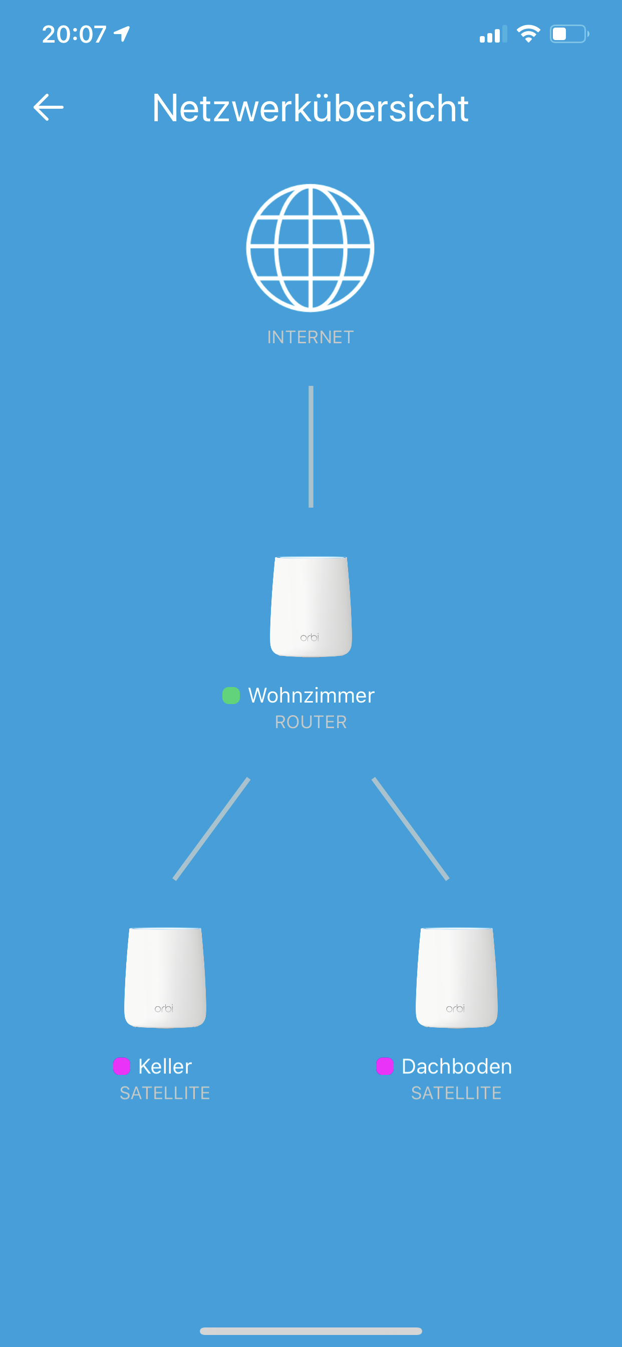 Meine Situation ist so, ich habe den Router im Wohnzimmer stehen, Satellit 1 steht im Keller und wird dort mit einem unter Putz Lankabel verbunden, Satellit 2 steht auf dem Dachboden und wird dort ebenfalls mit einem unter Putz Lankabel verbunden. Sowohl der Router, als auch die Satelliten sind im selben Netzwerk verbunden, das System funktioniert auch! Jedoch zeigt mit die App an das die Satelliten nicht da sind (Bild 2). Noch lustiger ist es auf der Seite orbilogin.net. Auf der Startseite wird mir unter angeschlossene Geräte gesagt, dass 2 Satelliten angeschlossen sind, wenn ich jetzt auf Angeschlossene Geräte gehe, sehe ich beide Satelliten und mir wird auch gezeigt das diese kabelgebunden sind.