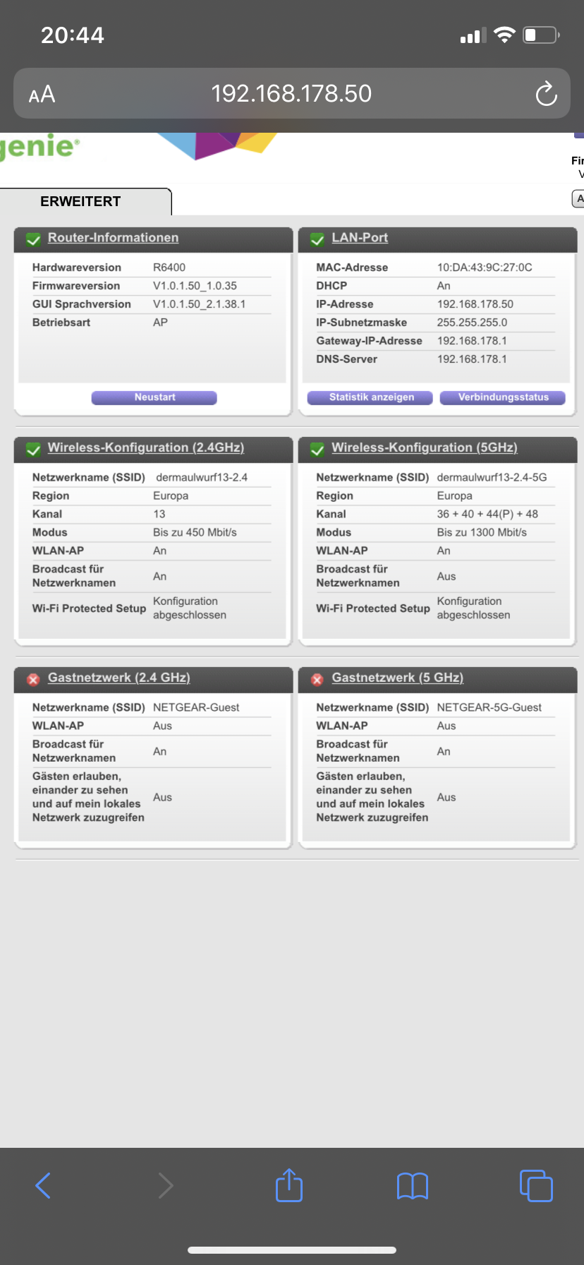Ja das habe ich alles schon versucht. Selben Endgeräte an der fritzbox und die volle Bandbreite ist da. Am R6400 und weg ist sie im wlan. Am lan ist das volle Volumen da. Ich habe mal ein paar Screenshots in den Anhang.